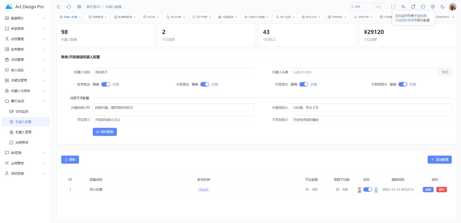有完整的im即时通讯功能,PC28也是可以聊天下注的,还有桌投、快投、信用投注这三种方式,充值提现都是多渠道,系统彩有预算开奖功能,好像还是自开奖的不需要添加计划任务
